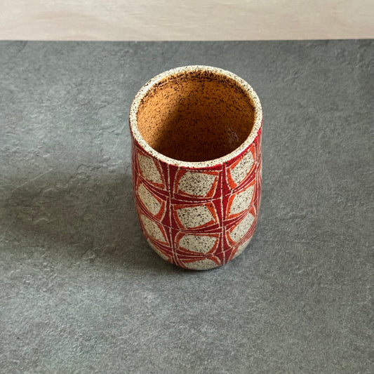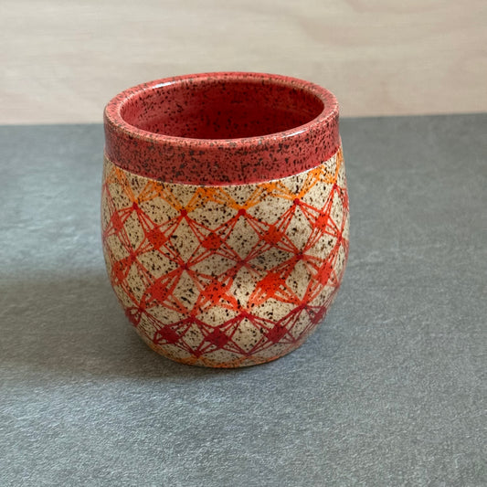 Orange and Red Cup with Tilting Square Tangles