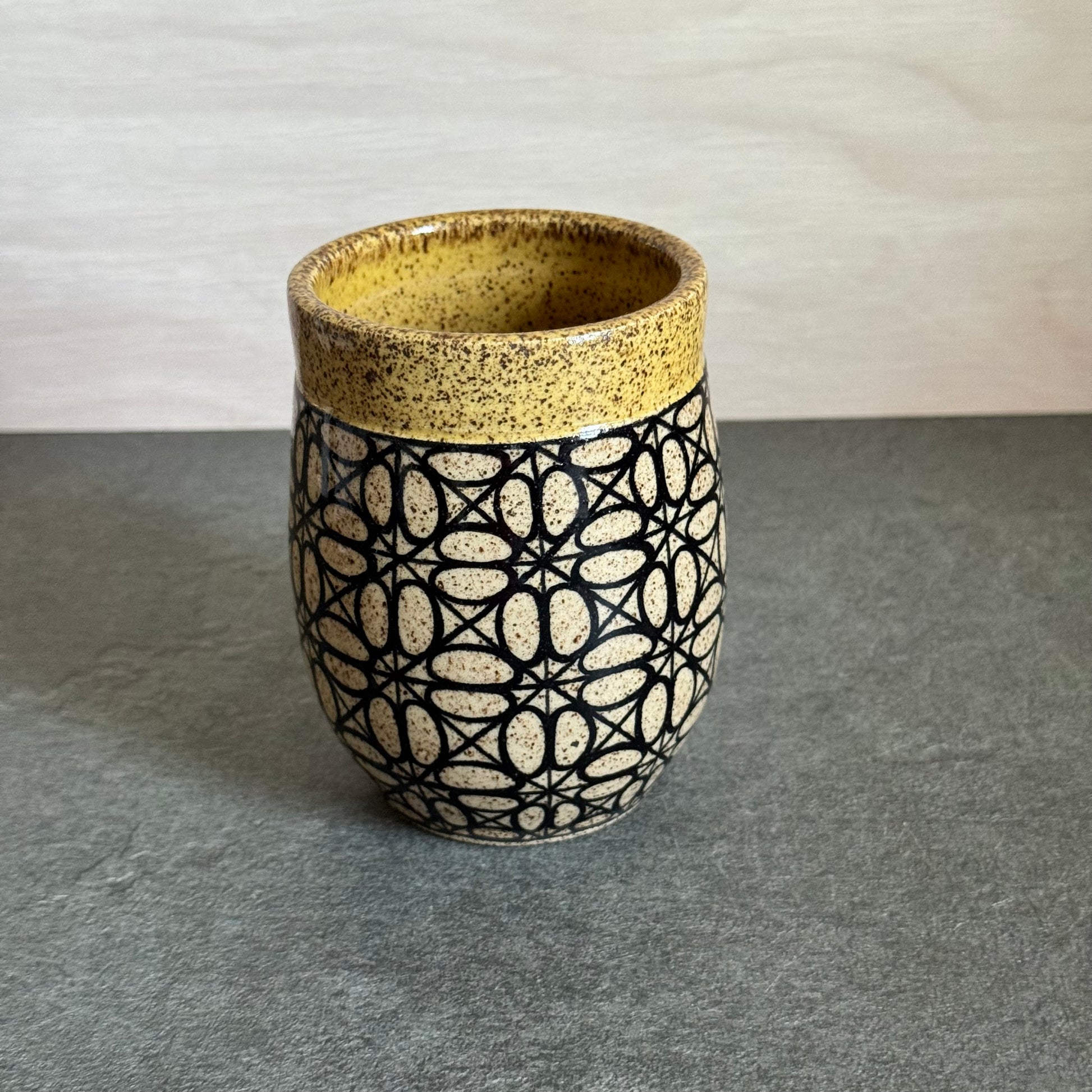 The warm yellow glaze on this cup complements the hand-painted black oval tangles on speckled tan clay.
