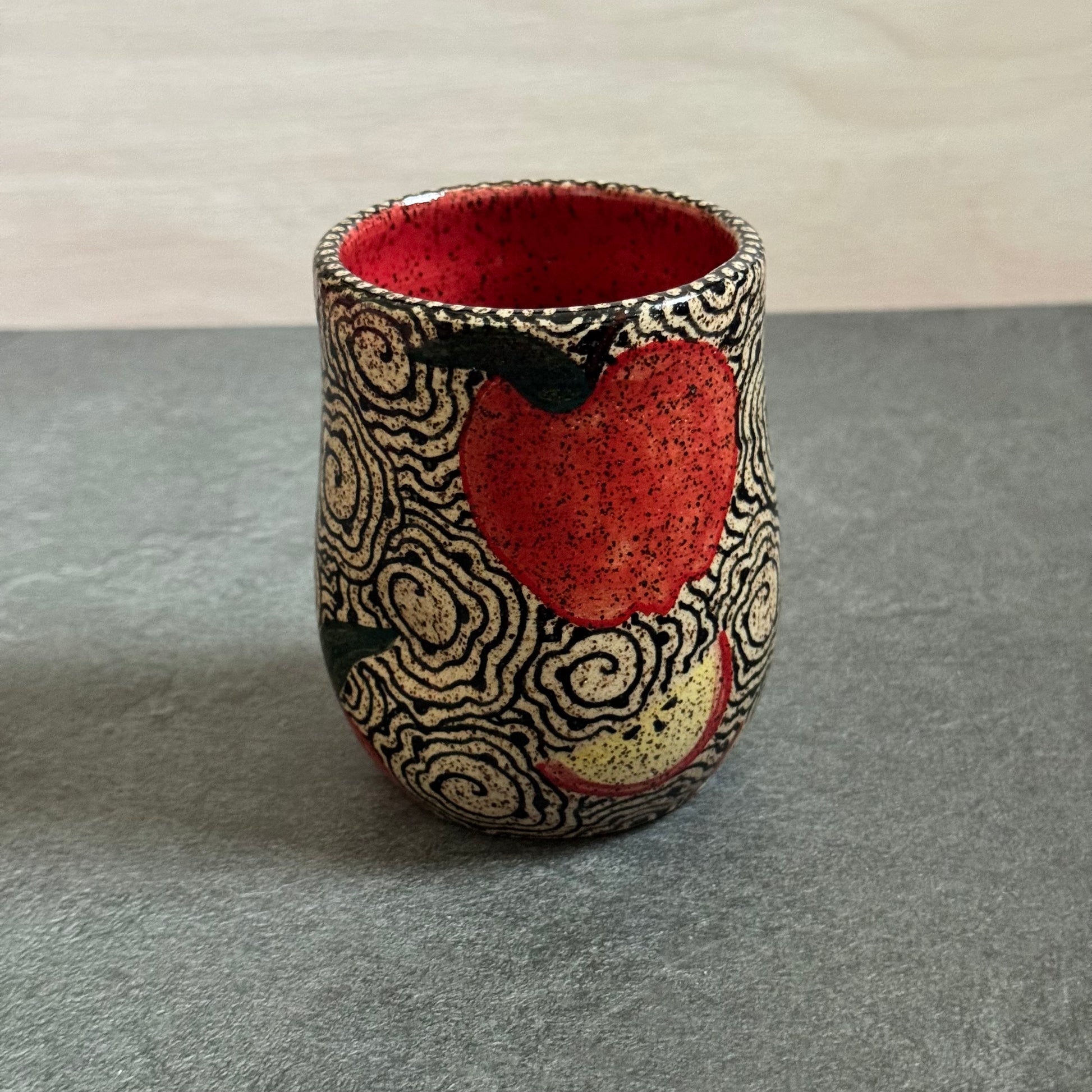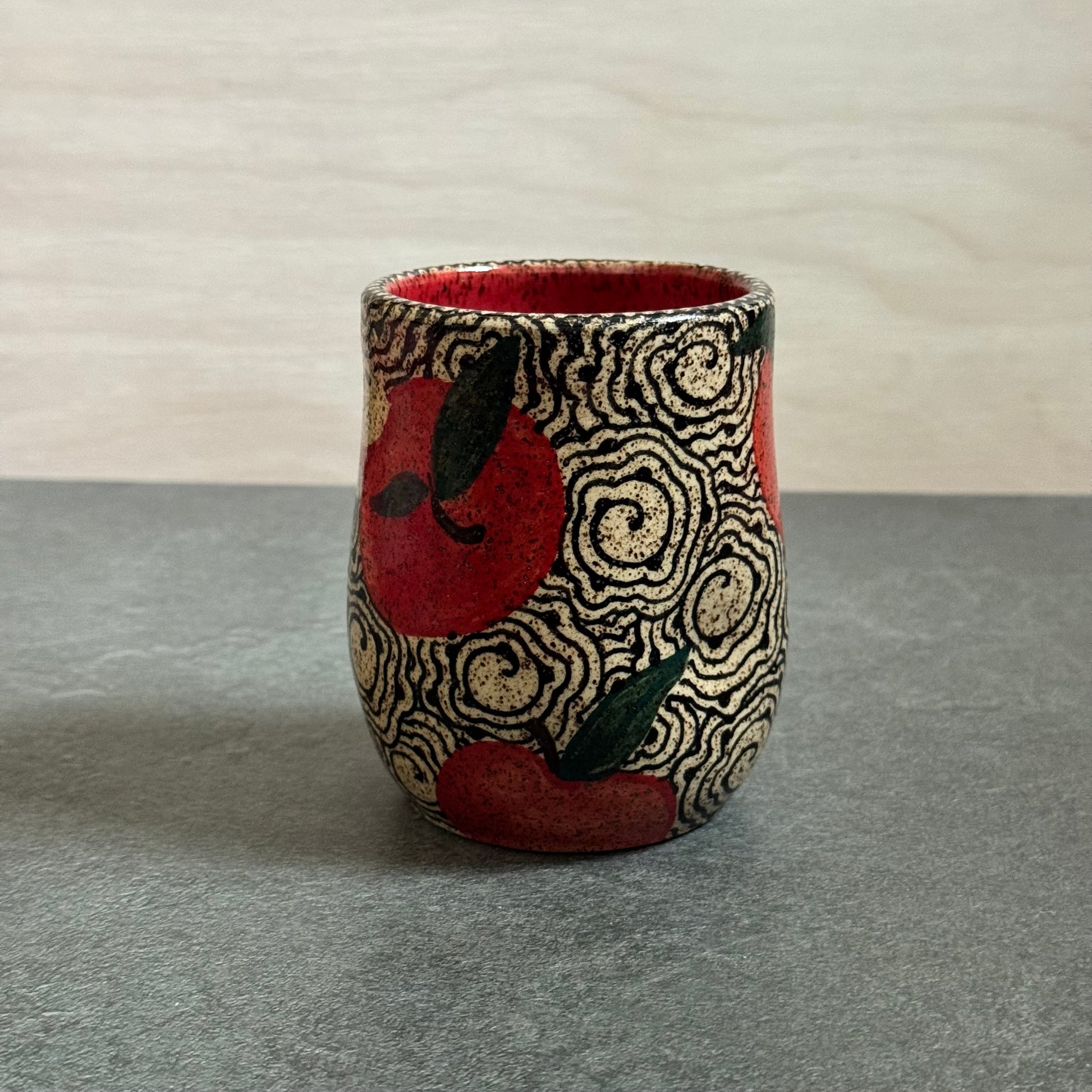The design on the surface of this cup features hand painted red apples on a swirly geometric background. The interior is red. There are 2 pinched indents on the cup for ease of holding. All designs are drawn on the surface using underglazes before the piece is glazed for the final firing.