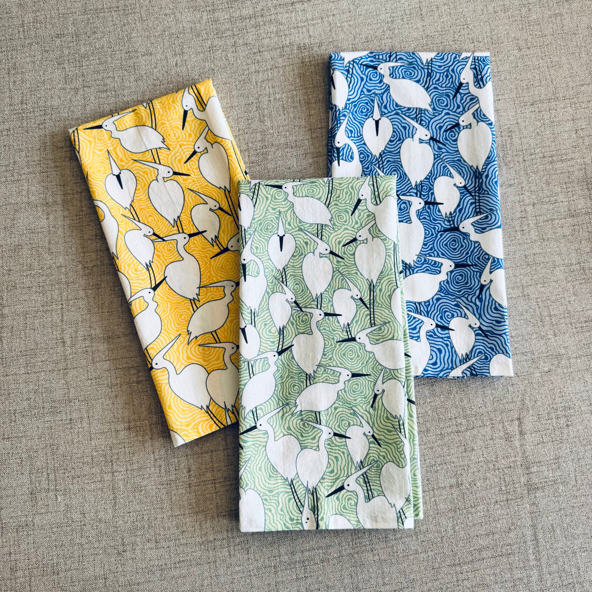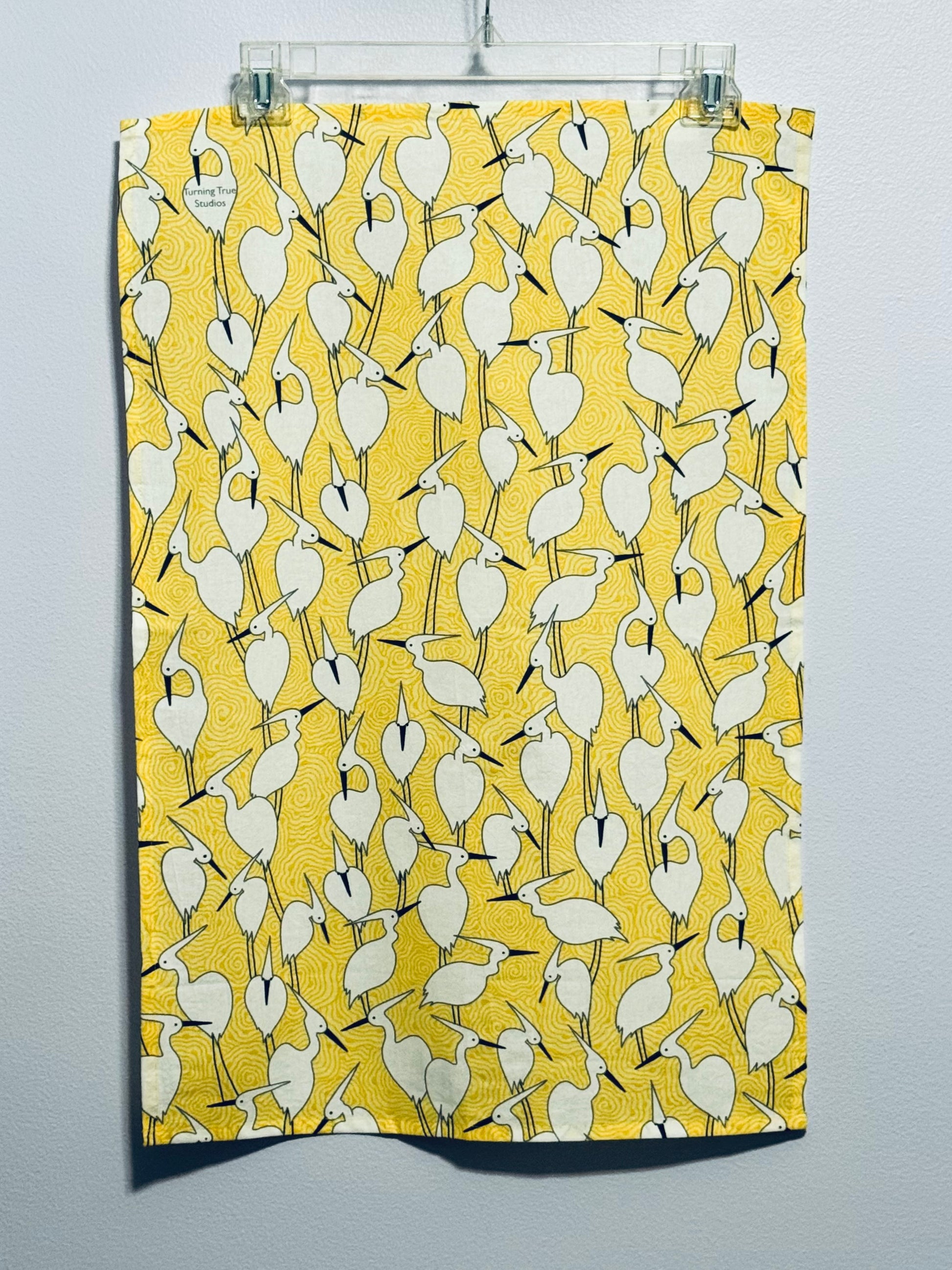 This 100% premium flour sack cotton towel features a dance of white cranes on a sunny yellow tangled background.
