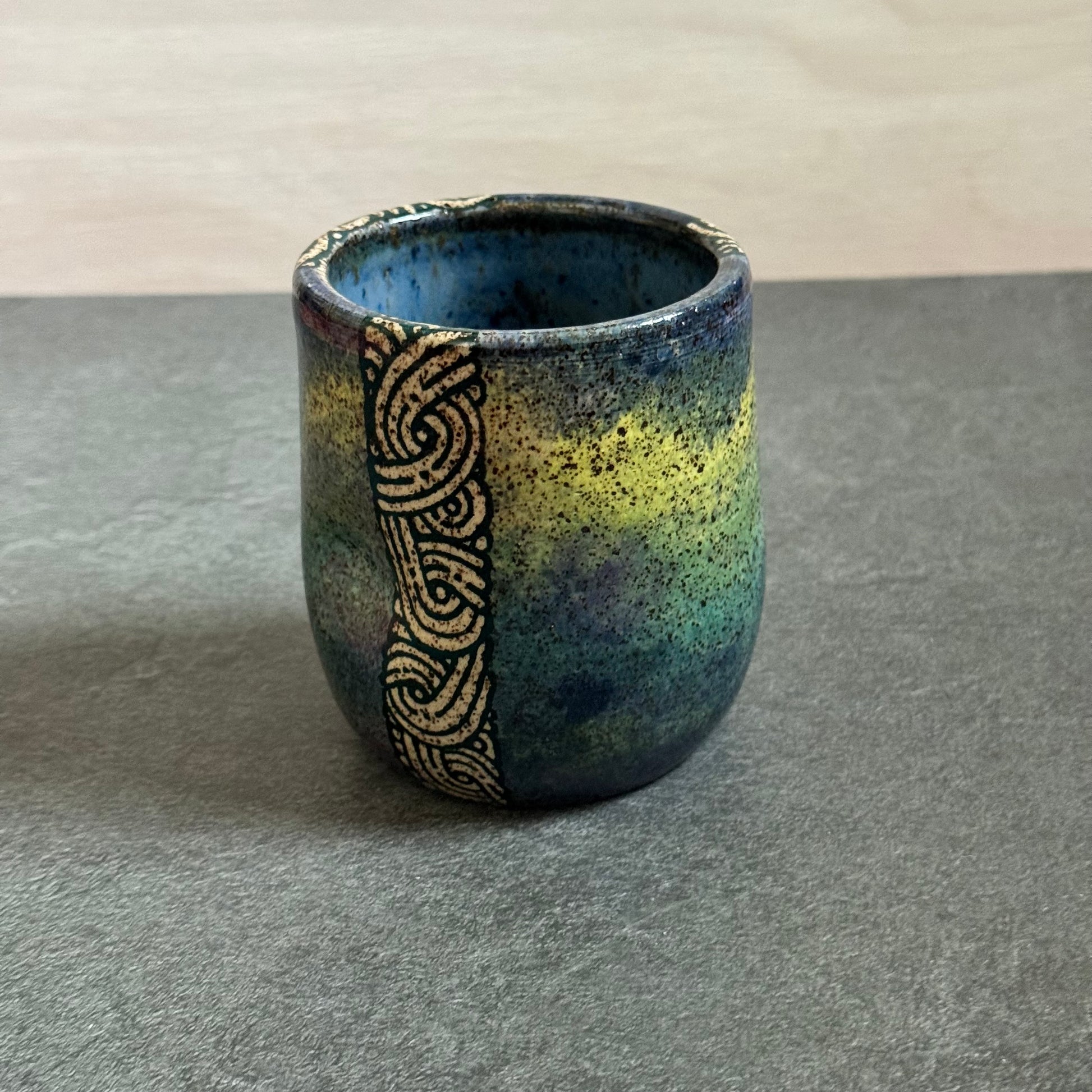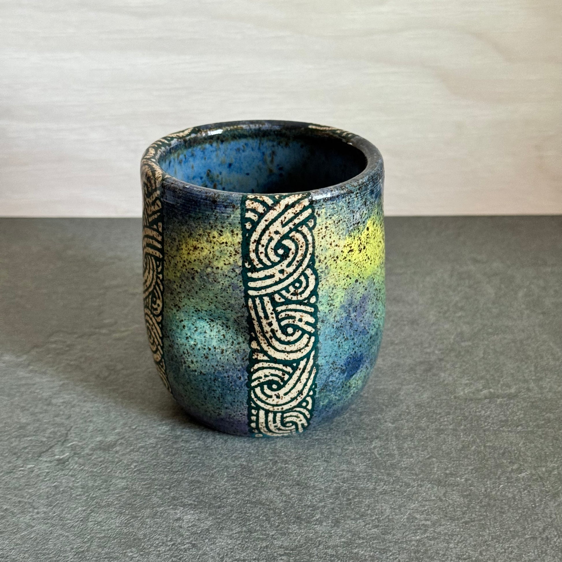 The design on the surface of this cup combines a hand painted geometric design with striped areas of colorful sponge painting. There are 2 dimples on the cup for ease of holding. All designs are drawn on the surface using underglazes before the piece is glazed for the final firing.