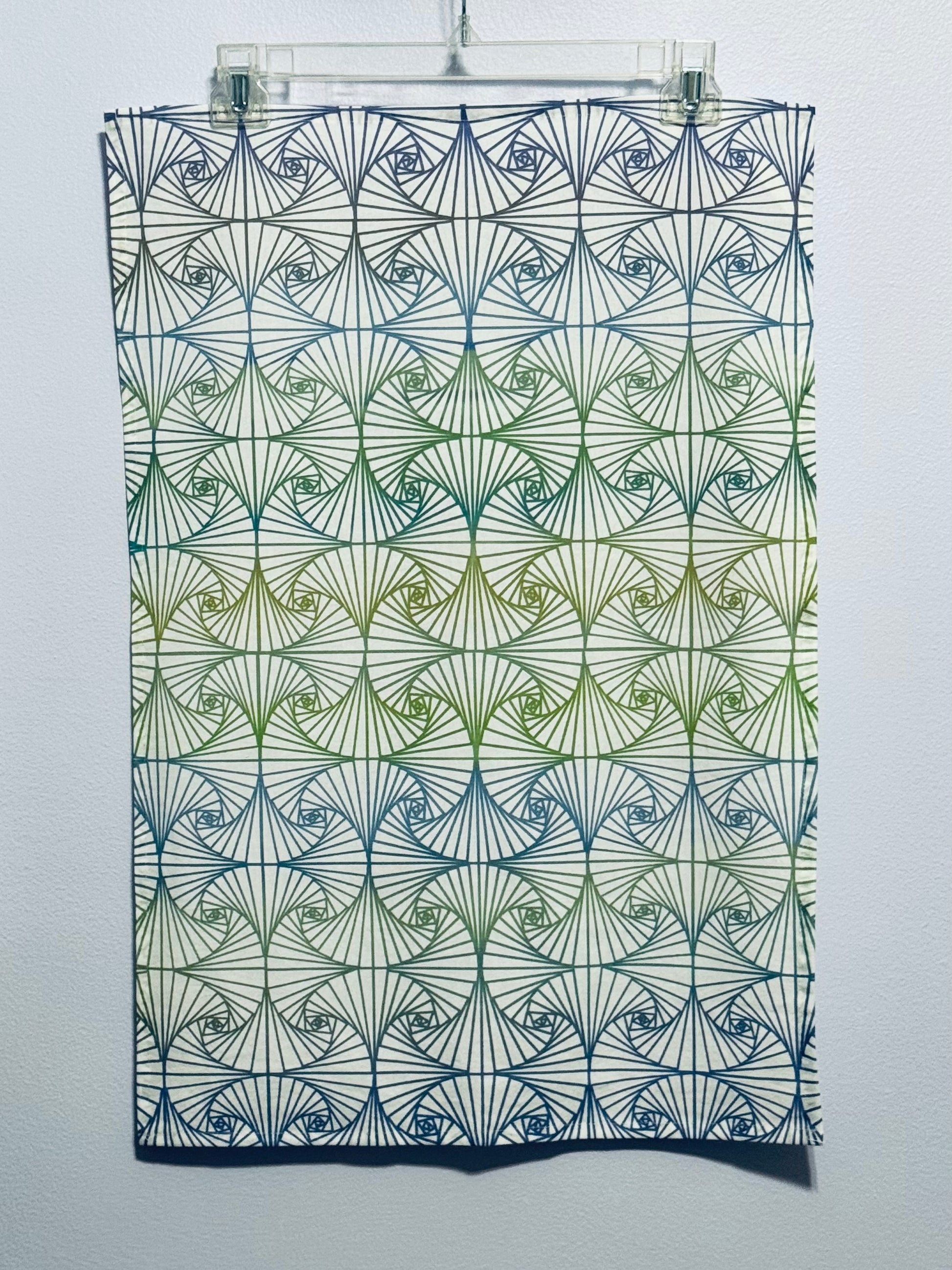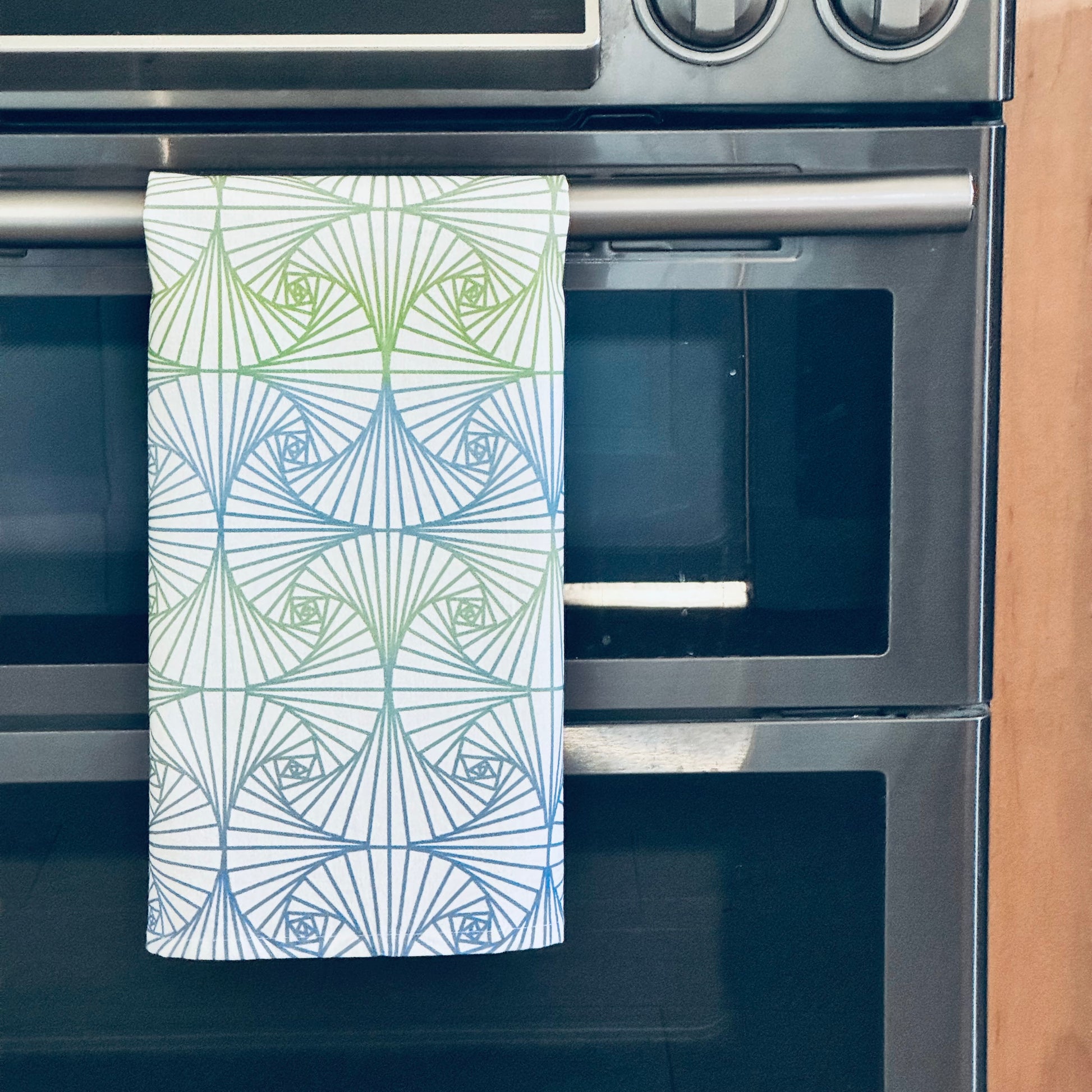This 100% premium flour sack cotton towel features a zentangle-inspired graphic in a ombre mix of blues and greens.