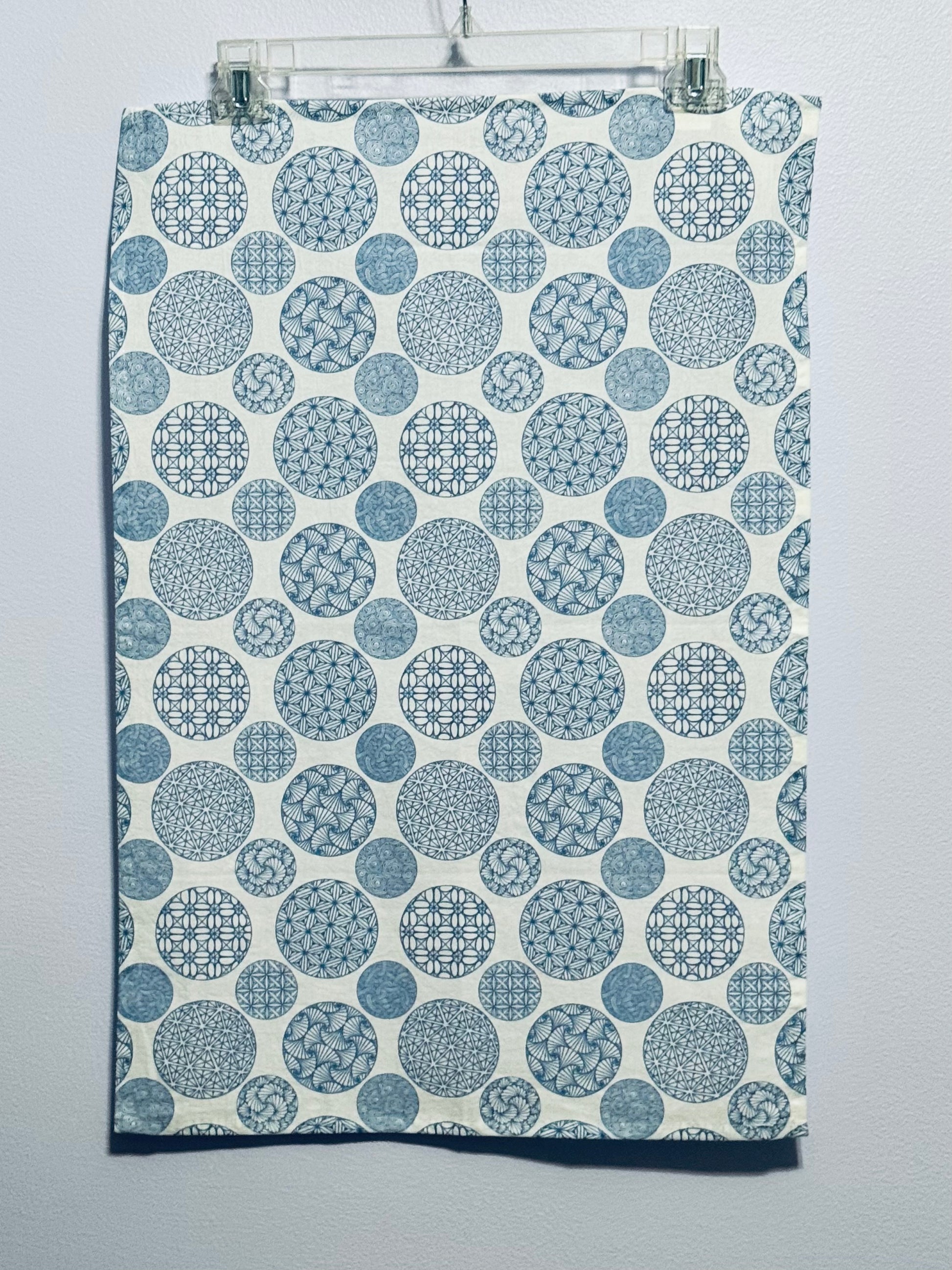 This 100% premium flour sack cotton towel designed with a scattering of blue circles that feature a variety of some of my tangled designs.
