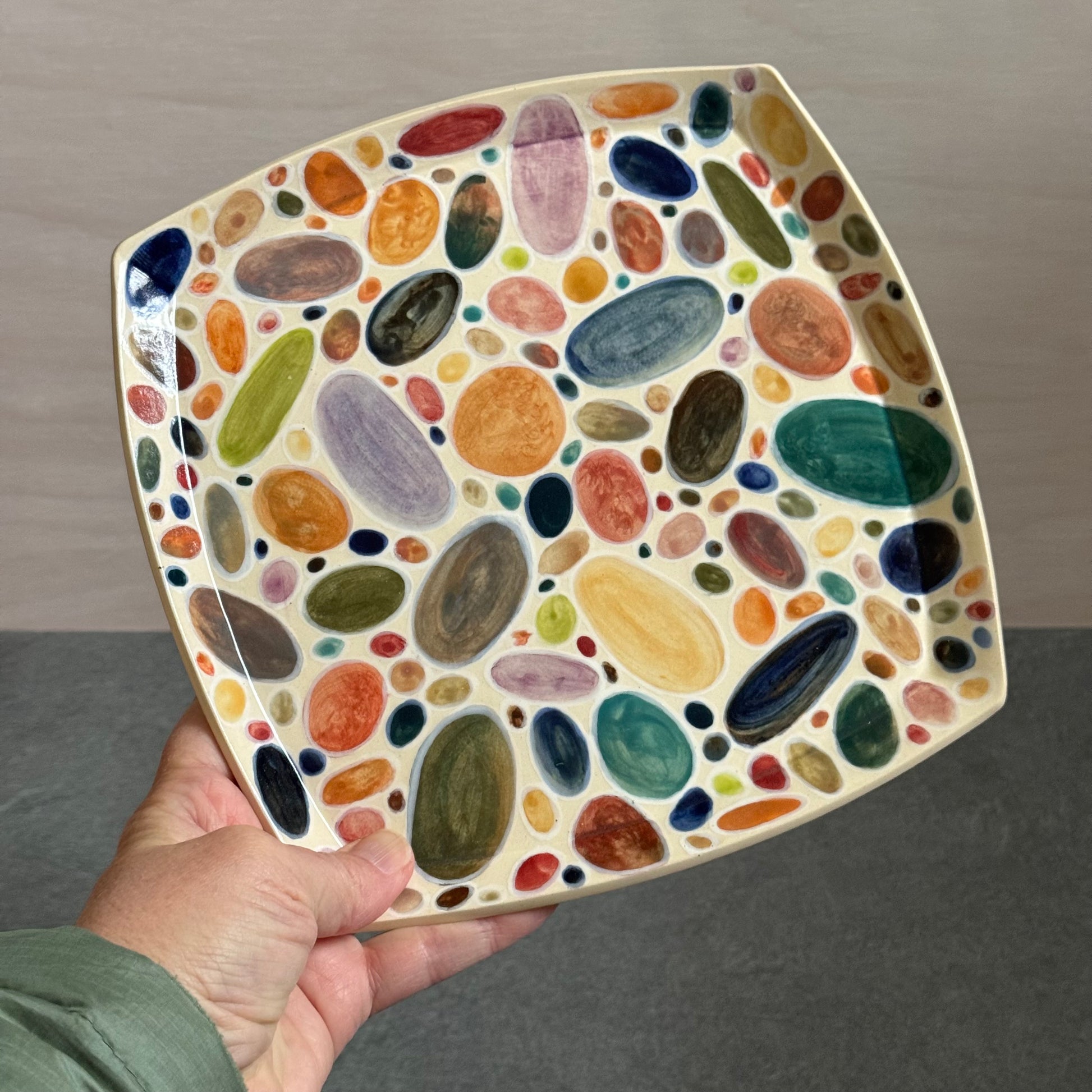 Created from a slab of clay, this tray will add a touch of color and pattern to any room! This piece was designed and hand painted to resemble the many colorful rocks I have collected over the years from the shore of Lake Michigan. A true one-of-a-kind piece of art that will coordinate with any decor!