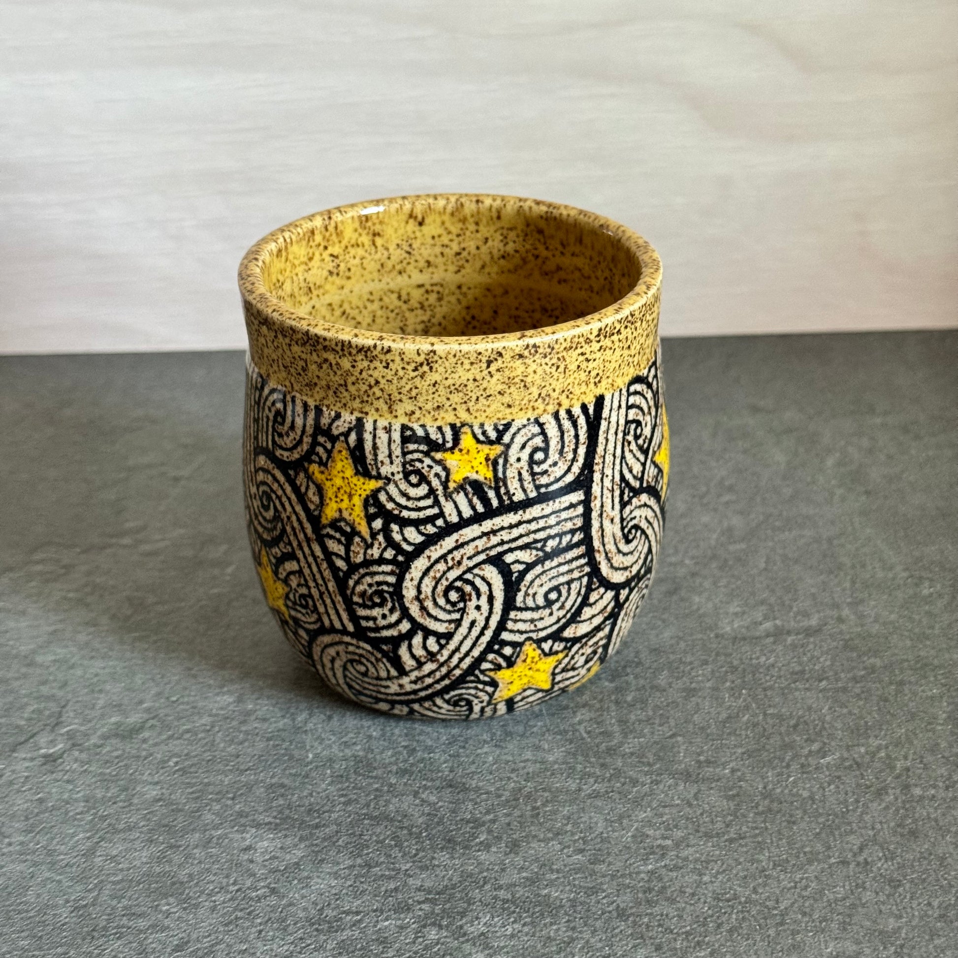 This banded cup features hand painted yellow stars twinkling on a tangled black swirly background bringing to mind the beauty of the night sky.